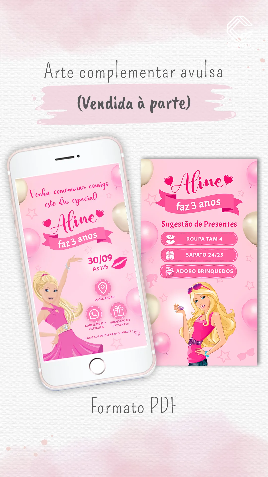 A arte do convite seguirá igual ao anúncio, com alterações apenas nos dados pessoais como nome, idade e local da festa.