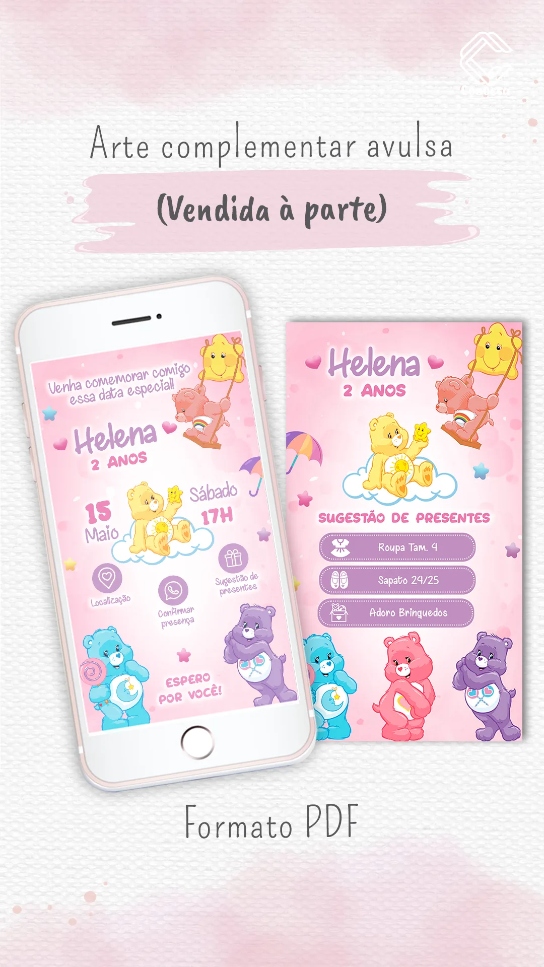 A arte do convite seguirá igual ao anúncio, com alterações apenas nos dados pessoais como nome, idade e local da festa.